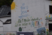 Nach nun über 50 gefahrenen Kilometern lud ich mein Fahrrad wieder in den Bus, checkte am Campingplatz aus und trat die Heimreise über Heimersheim an. Dort traf ich noch die junge Familie mit ihren drei Kindern. Wie zuvor bei Alex erzählte ich auch ihnen die Geschichte unseres Wunschbrunne e.V. – und überraschte sie schließlich mit einem Möbelhausgutschein, der sie bei ihrem für Oktober geplanten Umzug in ihr noch im Wiederaufbau befindliches Haus unterstützen wird.